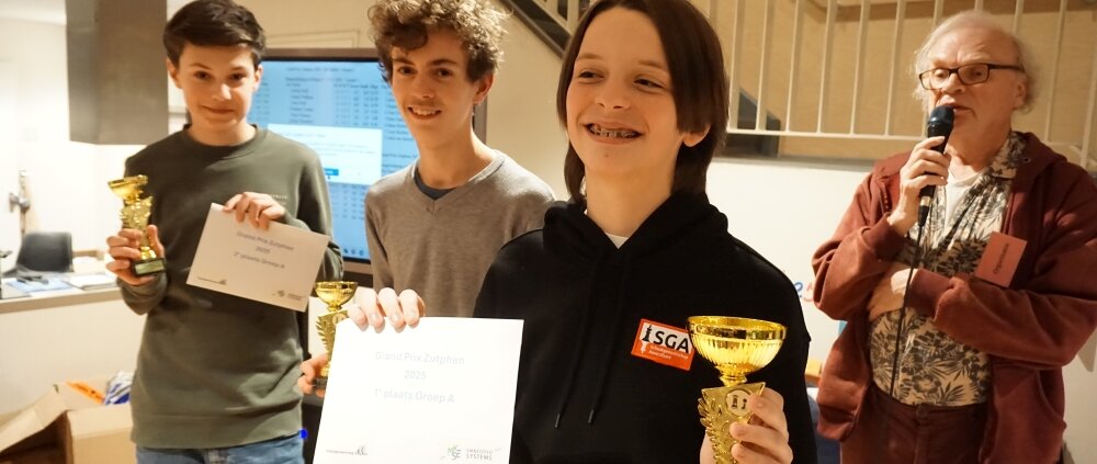 Afgelopen zondag was het afgeladen vol in Montessorischool de Plotter, waar de 12e editie van de Zutphense Grand Prix plaats vond. Het was de eerste keer dat het toernooi op een zondag gehouden werd. Hierdoor konden veel kinderen meedoen die op zaterdag andere sportactiviteiten hebben. Waarschijnlijk mede daardoor hadden we een recordopkomst: 83 kinderen! Met de kinderen waren ook veel ouders en begeleiders van clubs meegekomen, wat beneden voor een gezellige en ontspannen sfeer zorgde. Boven, waar de speellokalen waren, ging het er heel wat minder gemoedelijk aan toe. Daar werd in twee topgroepen (ieder 6 spelers, speeltempo 20 min. p.p. + 5 sec. per zet) en negen gewone groepen (speeltempo 15 min. p.p.) gestreden om de ereplaatsen.